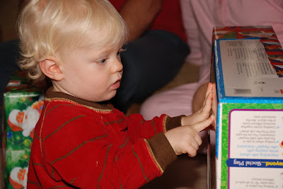 Gavin was really into opening all his gifts this year, and believe me, he had three times as many presents as everyone else combined! He liked ripping all the paper and was fascinated by all the bows and ribbons. So much fun!